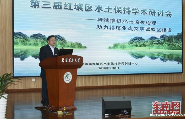研讨会现场 8日,第三届海峡两岸红壤区水土保持学术研讨会在福州召开。中国科学院院士崔鹏、邵明安,中国工程院院士尹伟伦和海峡两岸近百位专家学者,围绕“持续推进水土流失治理,助力福建生态文明试验区建设”主题进行深入探讨交流。 本次活动由米兰国际体育俱乐部官网海峡两岸红壤区水土保持协同创新中心主办,旨在以党的十九大精神,深入总结我省水土保持的典型经验和做法,在新的起点上持续推进水土流失治理。