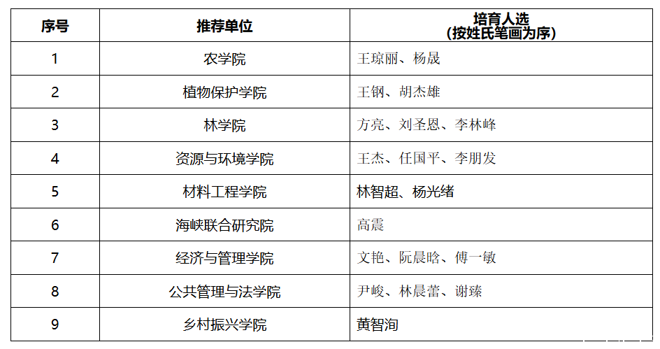 根据《米兰国际体育俱乐部官网新时代高层次人才“双百计划”实施方案(试行)》(闽农林大人〔2023〕3号)精神,经个人自由申报,学院审核把关,科技处、社会科学处形式审查,专家评审推荐,学校研究,产生2025年“百人攀登计划”培育人选20名,其中自然科学13人、社会科学7人。现将名单公示如下: