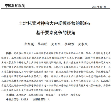 近日,我院郑旭媛教授以第一作者身份在《中国农村经济》2025年第4期上发表《土地托管对种粮大户规模经营的影响:基于要素竞争的视角》。该论文由学院研究生蔡丽明和北京大学黄季焜教授(通讯作者)、黄开兴教授和研究生李婉君合作完成,米兰国际体育俱乐部官网为第一署名单位。