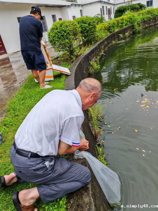 6月3日上午,校老体协钓鱼队的几位老同志齐聚蜂学与生物制药学院旁老体协钓鱼队活动的池塘旁,进行鱼苗投放活动。