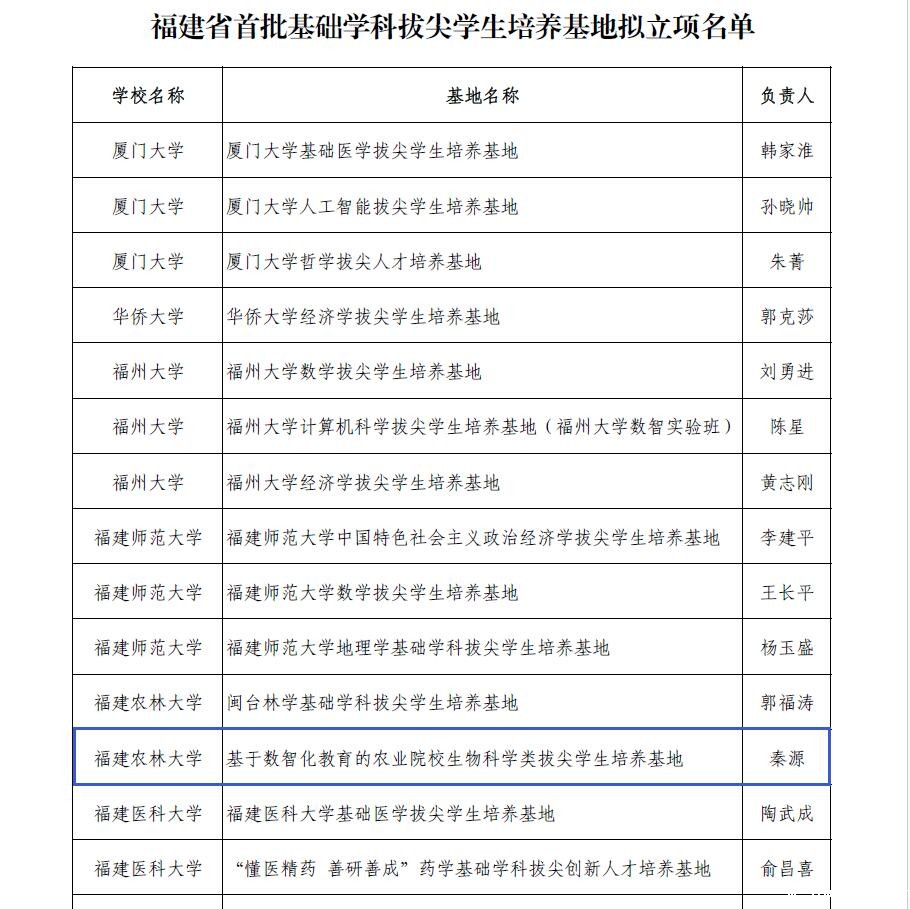 9月3日,福建省教育厅公示了福建省首批基础学科拔尖学生培养基地拟立项名单,生命科学学院申报(未来技术学院配合)的“基于数智化教育的农业院校生物科学类拔尖学生培养基地”成功入选。