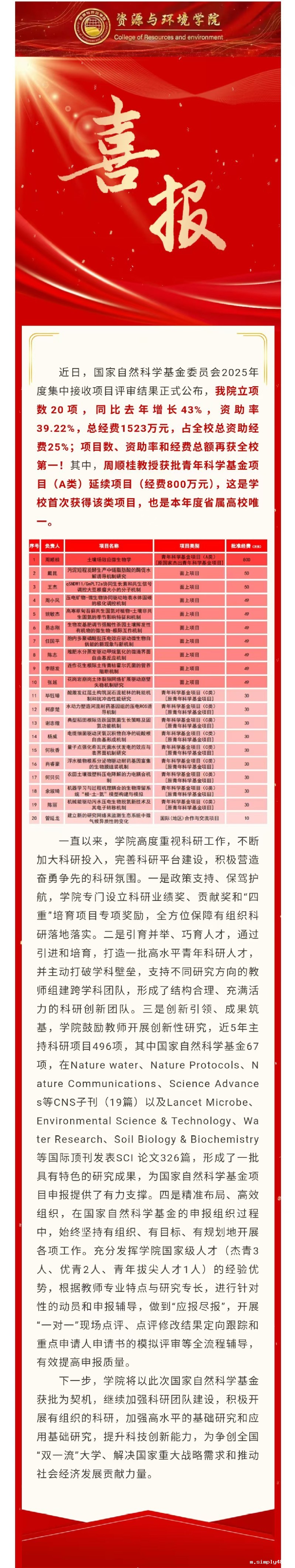 全校第一!资源与环境学院获批国家自然科学基金项目数再创新高
