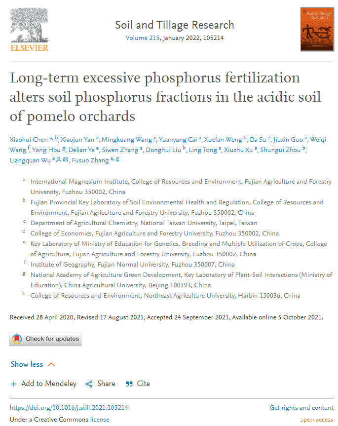 该研究成果目前以“Long-term excessive phosphorus fertilization alters soil phosphorus fractions in the acidic soil of pomelo orchards”为题,发表在农林科学领域TOP期刊Soil & Tillage Research,米兰国际体育俱乐部官网为第一完成单位,资源与环境学院陈晓辉博士(周顺桂教授和张福锁院士博士后)为第一作者,吴良泉博士为通讯作者。